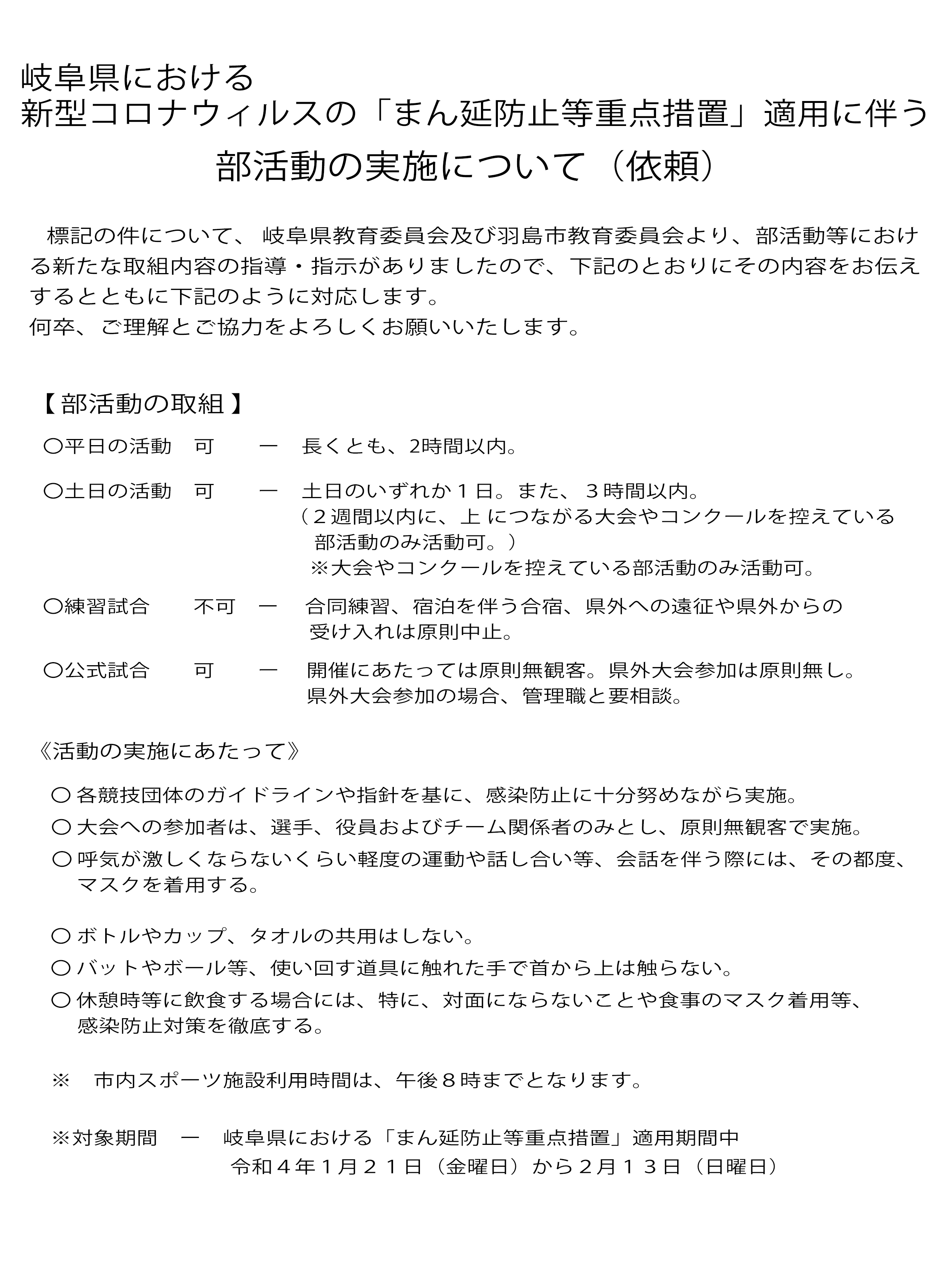 中学校クラブ まん延防止等重点措置 解除後のクラブ活動再開について 2022年3月24日 hashimanagomi はしまなごみスポーツクラブ まん延防止等重点措置が、3月21日をもって解除しましたので、休日(3時間程度)のクラブ活動が可能となりました。これからも感染防止に万全を尽 …