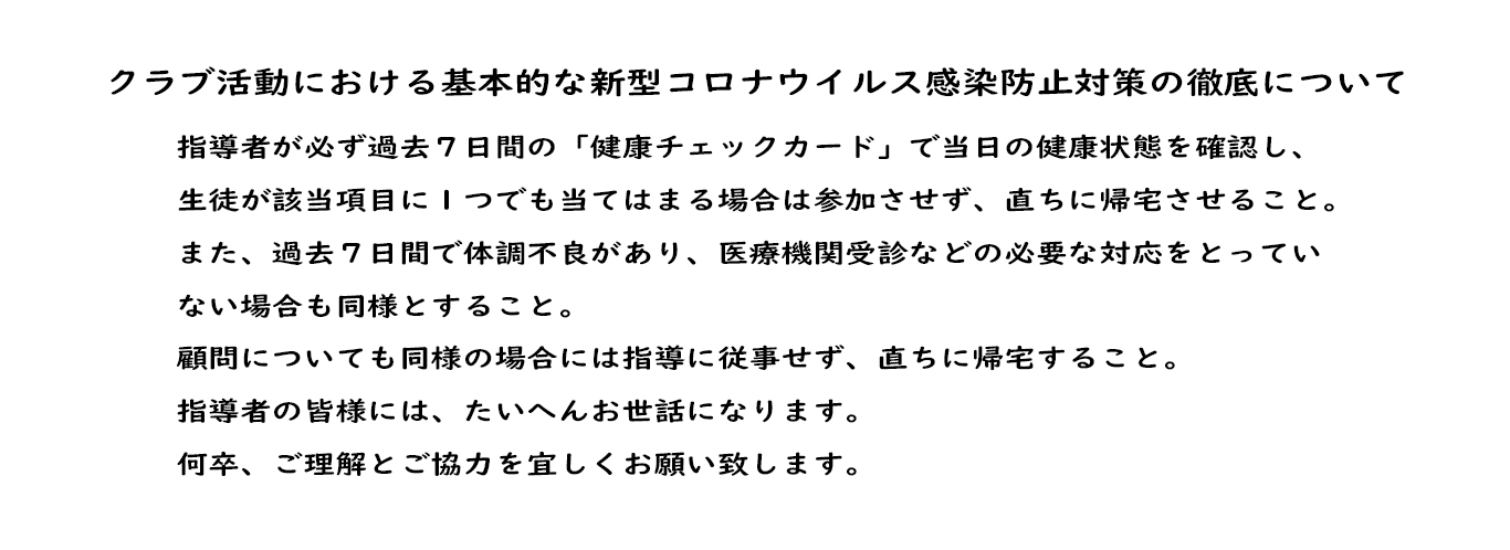 中学校クラブ クラブ活動における基本的な新型コロナウイルス感染防止対策の徹底について 2022年8月26日 hashimanagomi はしまなごみスポーツクラブ 指導者が必ず過去7日間の「健康チェックカード」で当日の健康状態を確認し、生徒が該当項目に1つでも当てはまる場合は参加させず、直ちに帰宅させ …